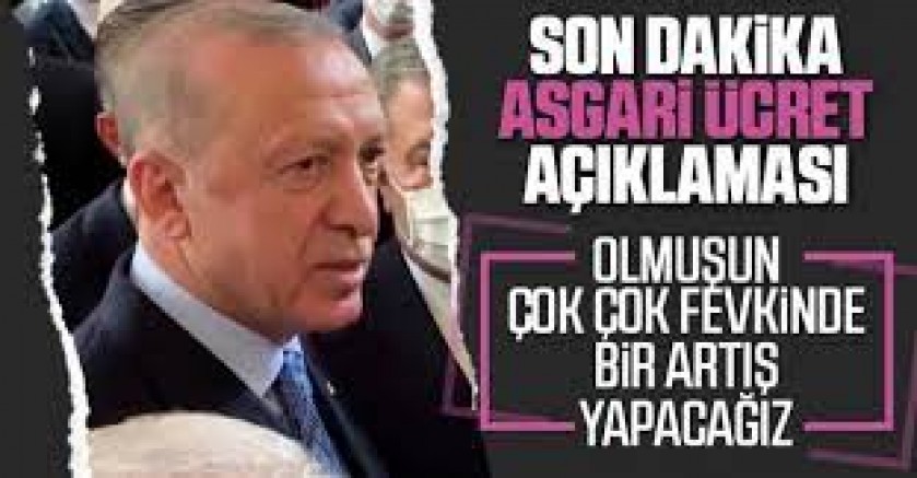 Cumhurbaşkanı Erdoğan, "Asgari ücretle ilgili çalışmalarımız sürüyor. En kısa zamanda açıklanacak. Asgari ücrete şu ana kadar olmuşun çok çok fevkinde bir artış yapacağız" dedi.