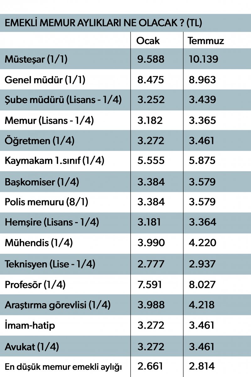 En düşük emekli memur aylığı da yılın ikinci yarısında 2 bin 661 TL’den 2 bin 814 TL’ye çıkacak.